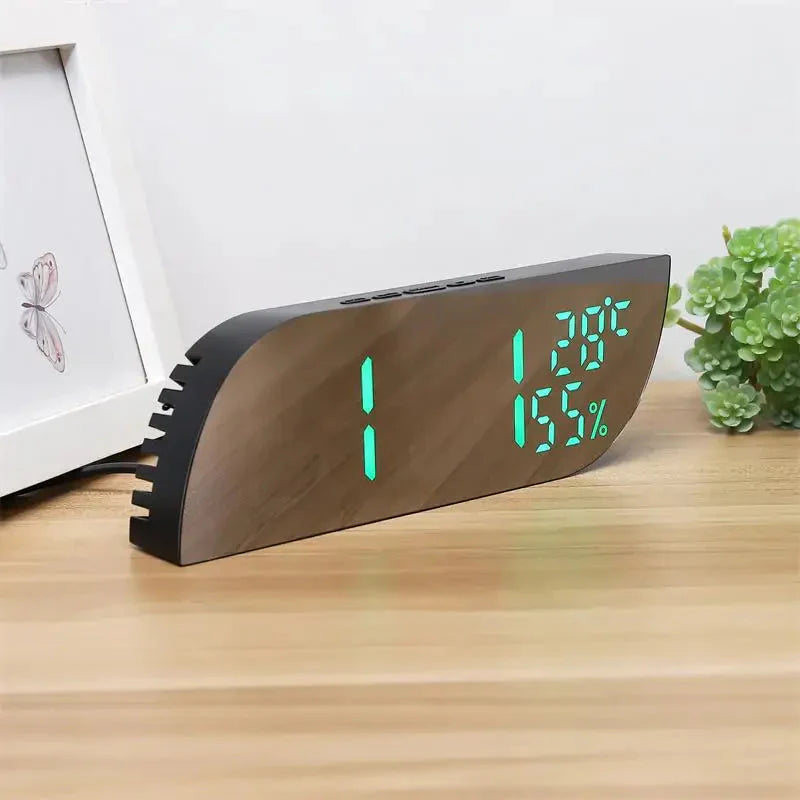 Trött på tråkiga väckarklockor som inte passar din inredning? Vår eleganta batteridrivna digitala väckarklocka med ljus är den perfekta lösningen för att vakna upp på ett smart och stilfullt sätt. Dess moderna design med trälook smälter sömlöst in i vilket sovrum eller kontor som helst. Förutom att visa tiden tydligt med stora, ljusa siffror, håller den dig även uppdaterad om temperaturen och luftfuktigheten i rummet. Ingen mer gissning om det är dags att slå på värmen eller öppna ett fönster – all information finns direkt på skärmen! Eftersom den är batteridriven kan du placera den var som helst utan att behöva oroa dig för sladdar.