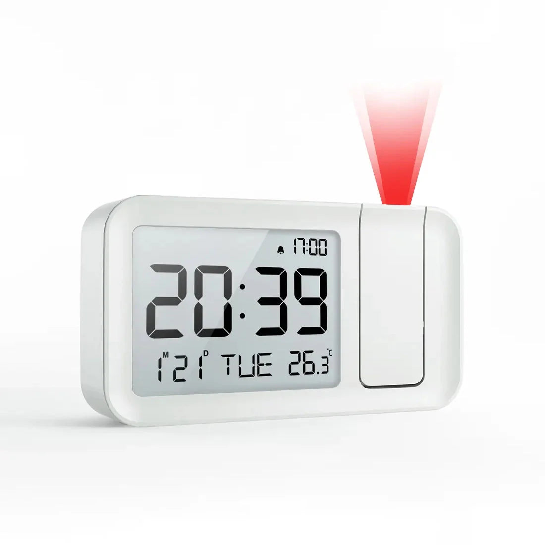 - Tydlig Projektion: En röd och skarp tidsvisning som enkelt projiceras på taket eller väggen.