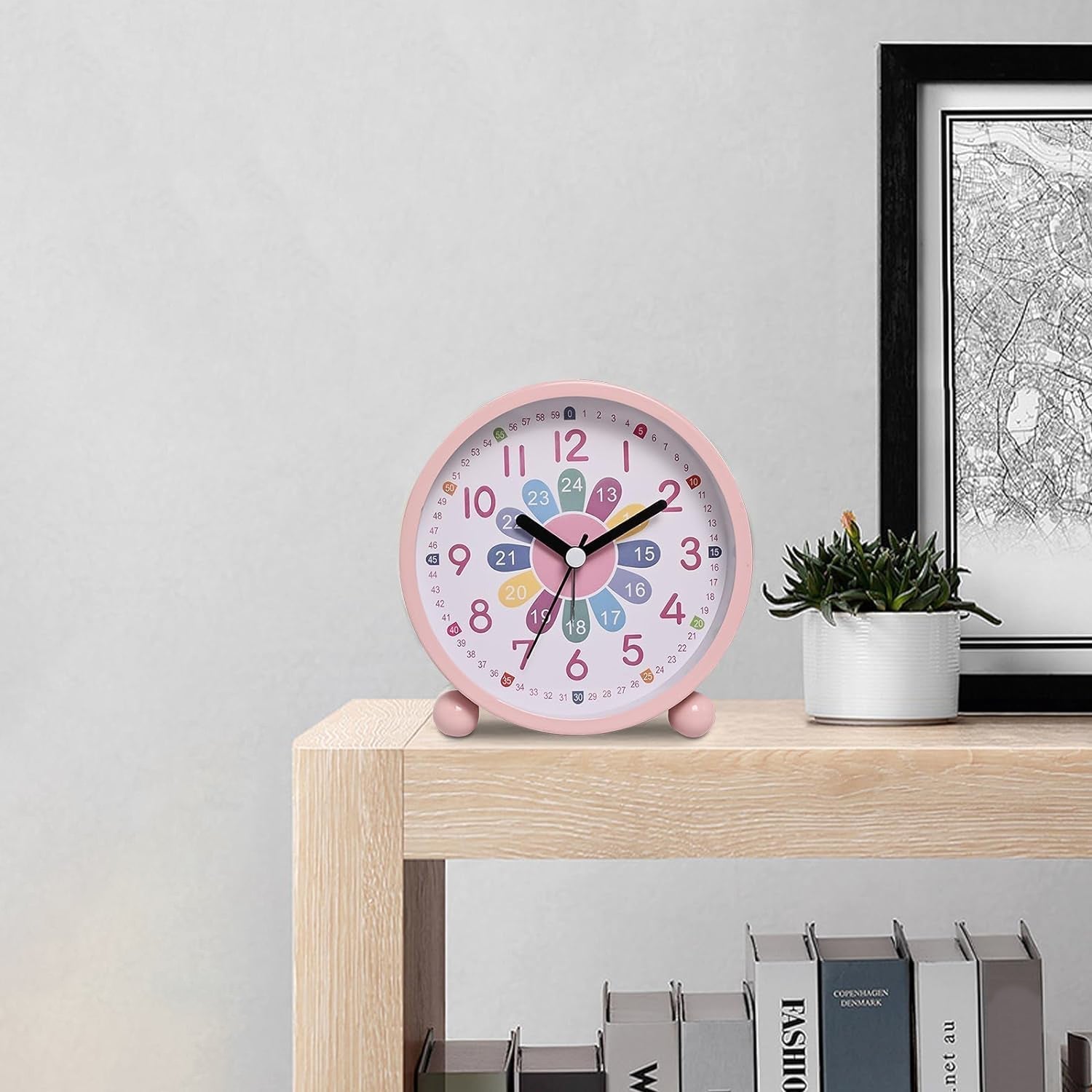 Att lära sig klockan är en viktig milstolpe i ett barns utveckling, och med vår väckarklocka blir det en fröjd! Urtavlan är smart utformad med både timmar och minuter tydligt markerade, vilket gör det enkelt för ditt barn att se sambandet mellan visarnas position och den faktiska tiden. De söta blompétalen i olika färger med siffror inuti hjälper till att visualisera minuterna på ett engagerande sätt. Dessutom är den tystgående, så ingen störande tickande ljud kommer att avbryta nattsömnen. Den är stabil tack vare sina små fötter och den rosa färgen kommer att smälta in perfekt i de flesta flickrum. En pedagogisk analog väckarklocka för flickor som denna är mer än bara en klocka – det är en investering i ditt barns utveckling.