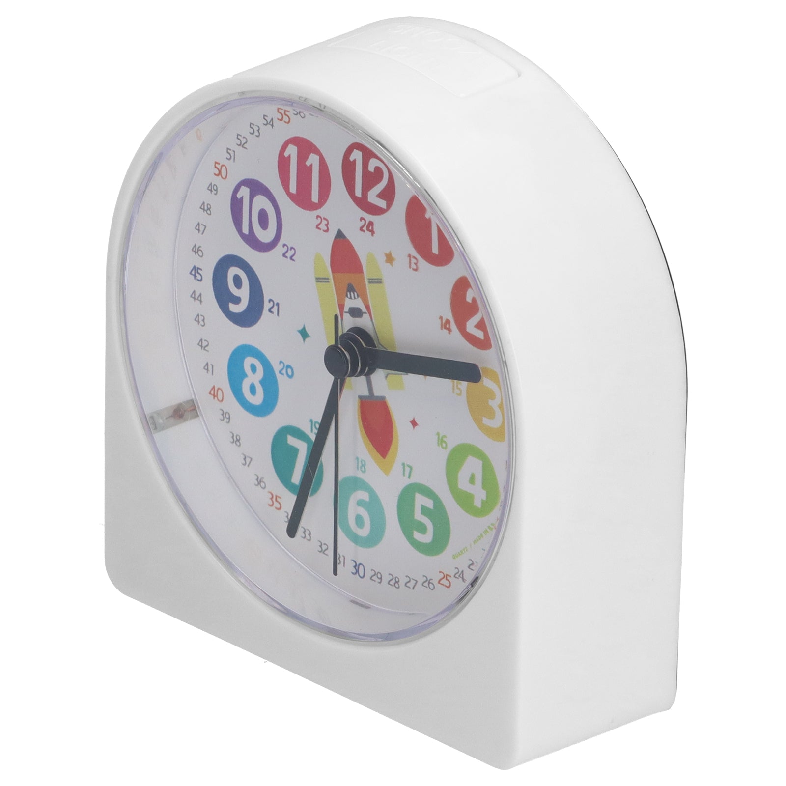 - Rolig och engagerande design: Med sin rymdraket blir det roligt att lära sig klockan.