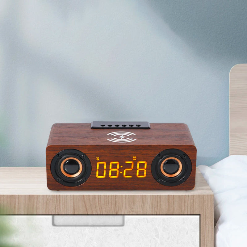 Denna Retro väckarklocka i trä med Bluetooth är utrustad med ett par kraftfulla högtalare som levererar ett klart och fylligt ljud. Anslut enkelt din telefon, surfplatta eller annan Bluetooth-enhet och spela upp din favoritmusik, podcasts eller ljudböcker. Vill du ladda din telefon under natten? Inga problem! Klockan har en praktisk trådlös laddningsfunktion på ovansidan, vilket innebär att du slipper trassliga kablar och alltid har din enhet fulladdad när du vaknar. Den inbyggda mikrofonen gör det dessutom möjligt att ta handsfree-samtal direkt via klockan, perfekt för de gånger du vill fortsätta med dina morgonbestyr utan att behöva plocka upp telefonen. Allt detta gör den till en oslagbar kombination av bekvämlighet och stil.