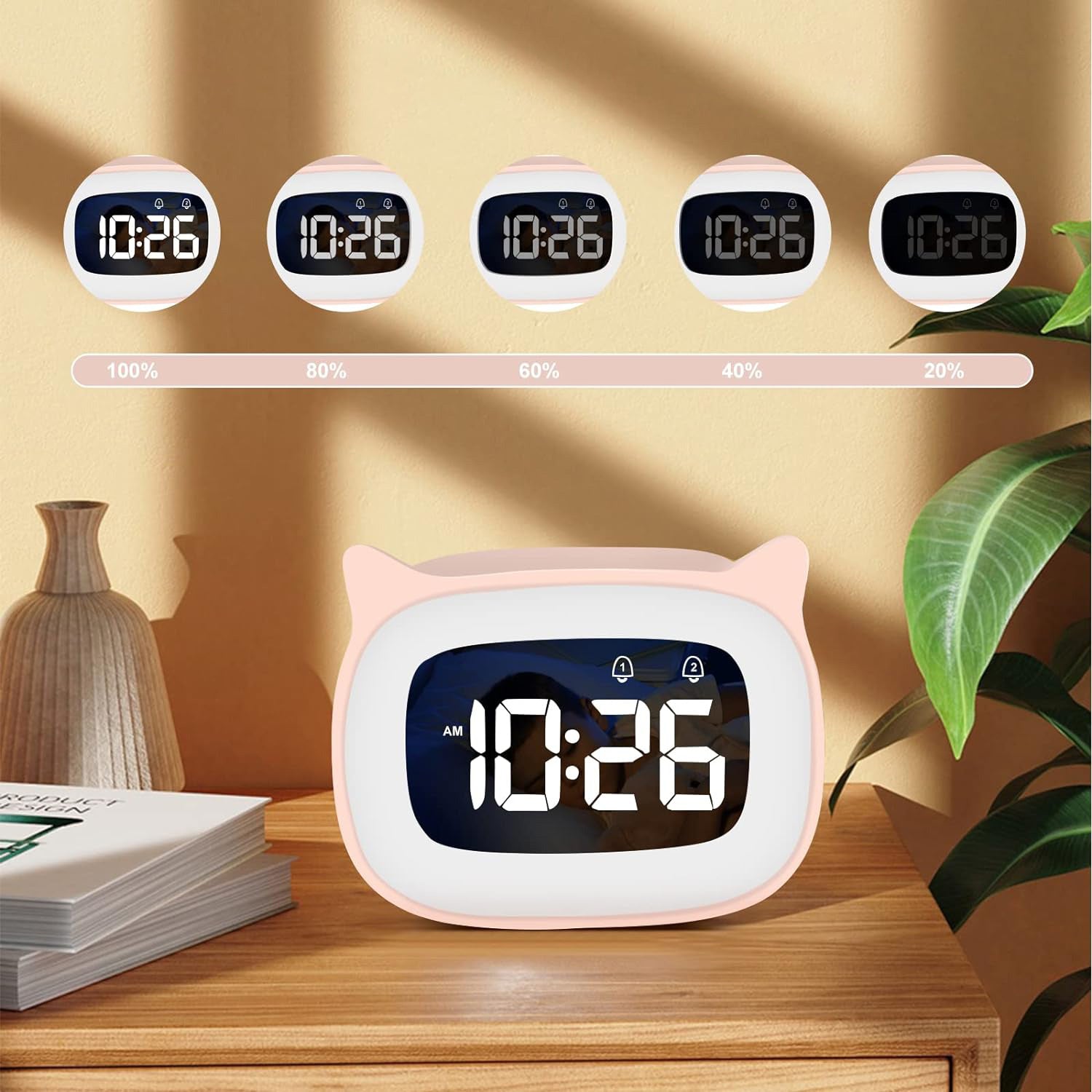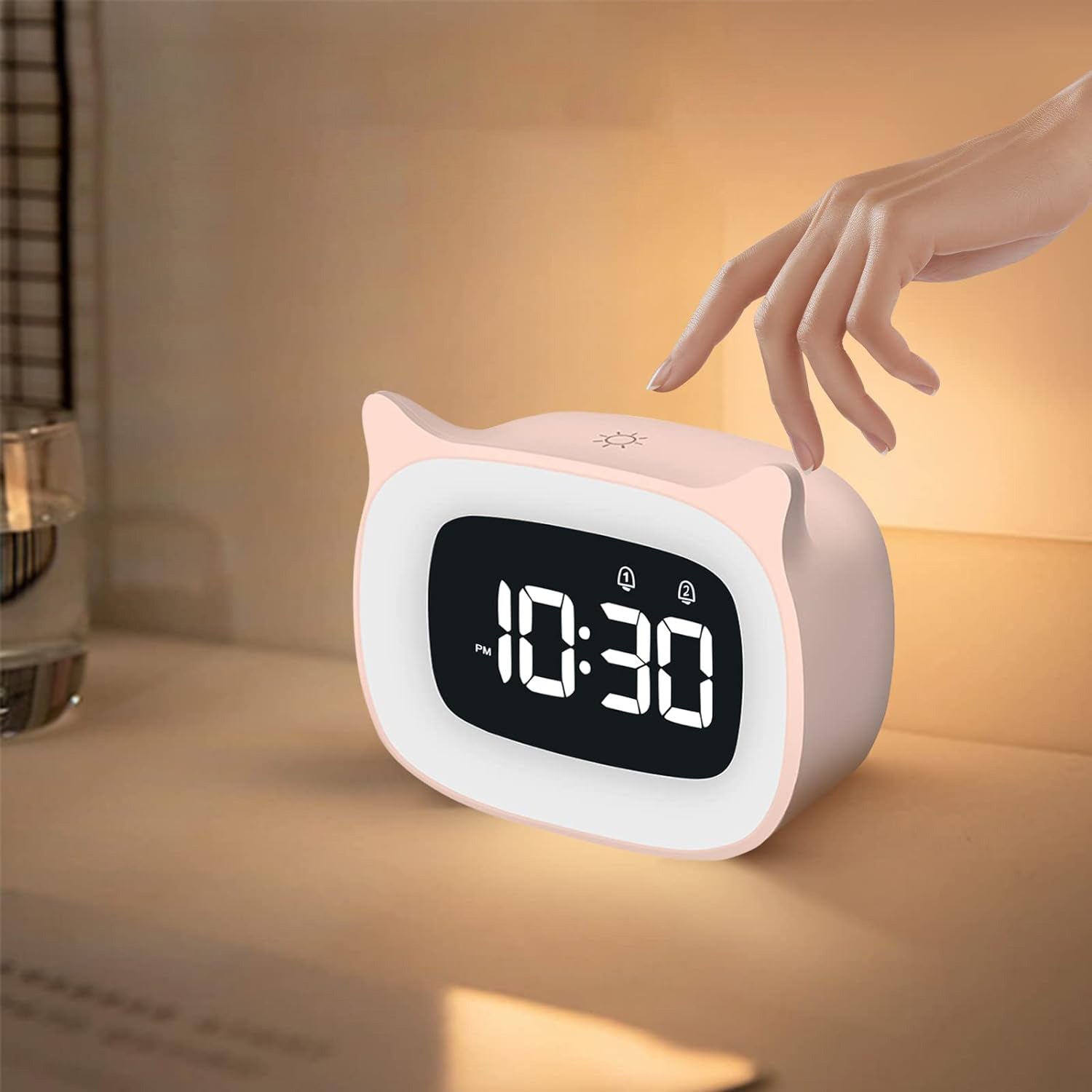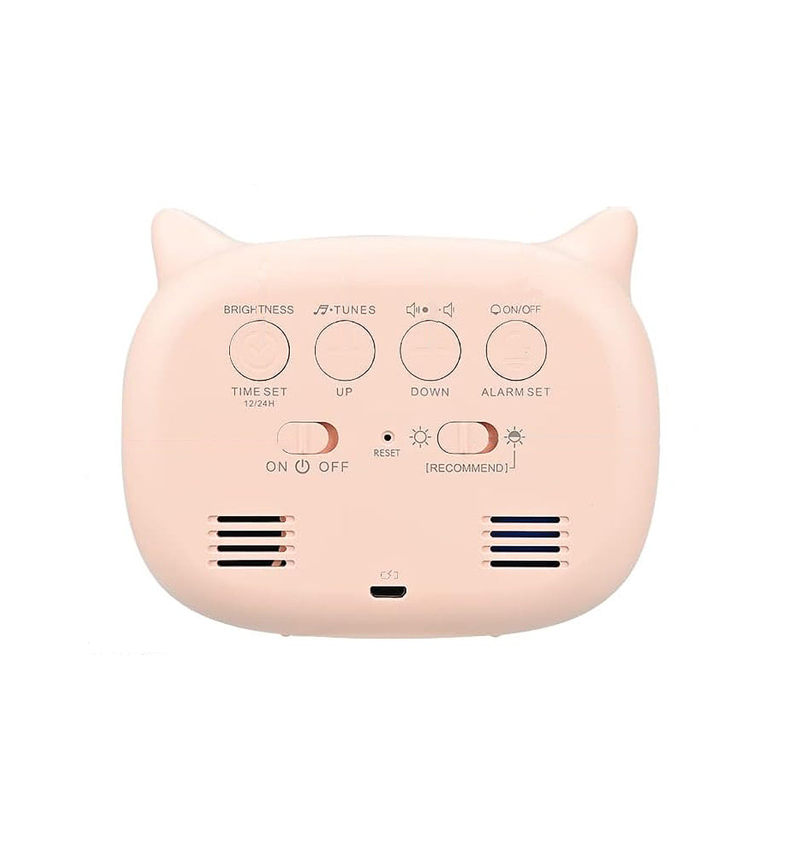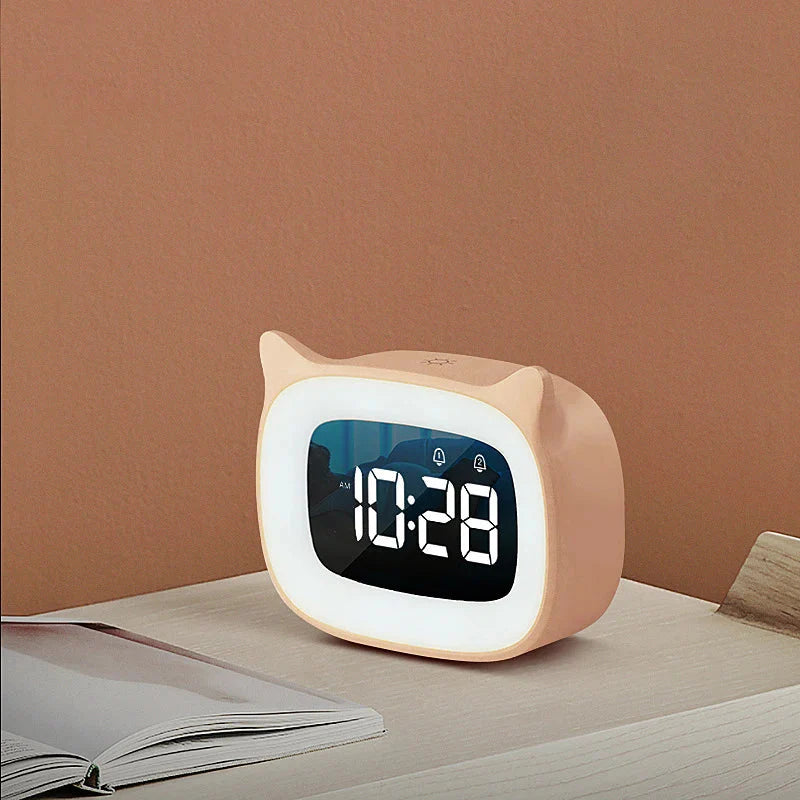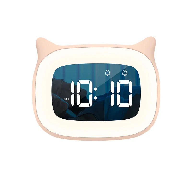 Denna charmiga rosa väckarklocka är mer än bara en tidsvisare; den är en inbjudan till en lugn morgon och en trygg natt. Med sin söta kattformade design och mjuka färg smälter den perfekt in i barnrummet eller på ditt eget nattduksbord. Den stora, tydliga digitala displayen gör det enkelt att se tiden, oavsett om det är mitt i natten eller tidigt på morgonen. Bilden på en sovande person i bakgrunden signalerar en avkopplande atmosfär, vilket förstärker känslan av att denna klocka är designad för ditt välbefinnande dygnet runt.