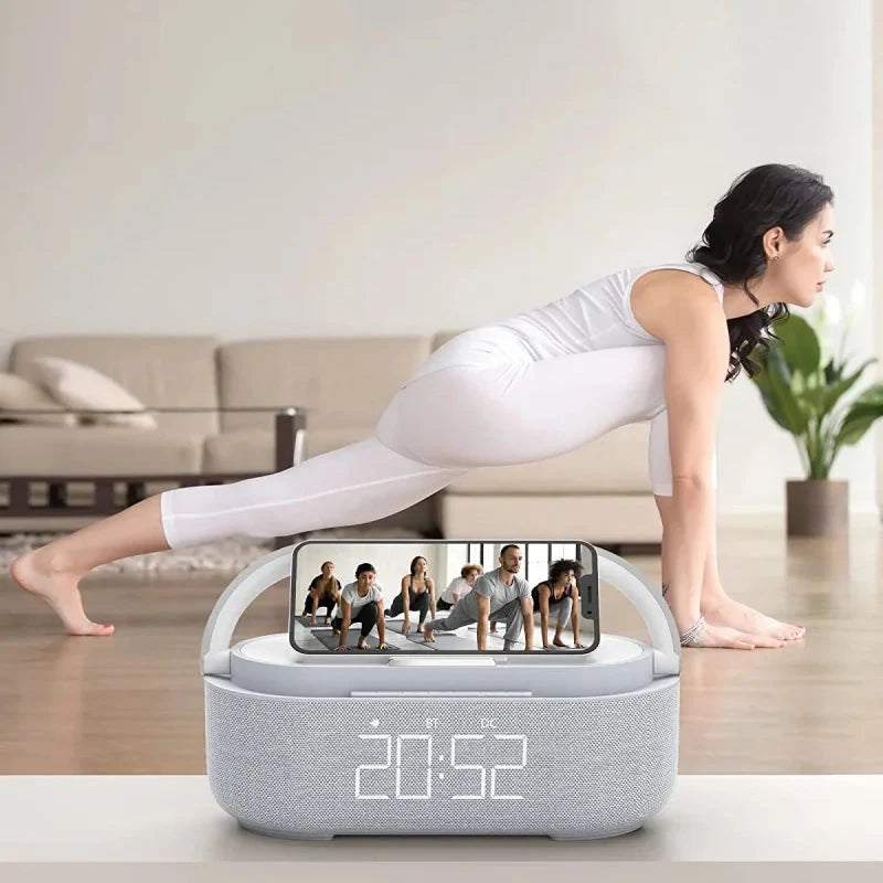 Trött på att vakna stressad och med röriga sladdar? Vår smarta klockradio med lampa och laddare är designad för att göra dina morgnar lugnare och mer organiserade. Föreställ dig att vakna upp till ett mjukt ljus, med din favoritmorgonshow spelande, medan din telefon laddas trådlöst precis bredvid dig. Den här enheten är mer än bara en väckarklocka; den är en komplett lösning för ditt nattduksbord, som förenar estetik med modern funktionalitet. Den eleganta designen med trädetaljer och tyg passar perfekt in i de flesta inredningsstilar och blir en snygg detalj i ditt sovrum.