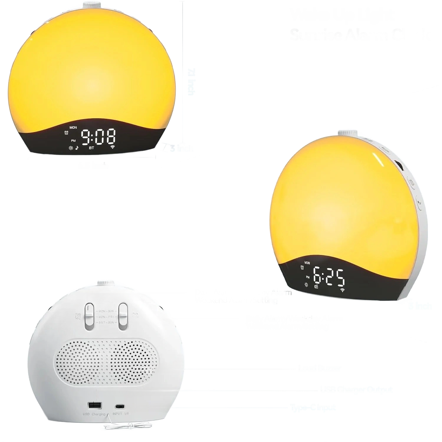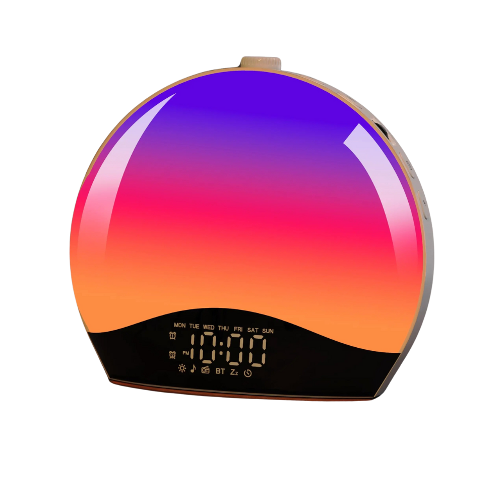 Föreställ dig en värld där du vaknar mjukt och naturligt, istället för att ryckas upp av ett skärande larm. Vår smarta klockradio med soluppgångsljus är designad för att förvandla din morgonrutin. Den imiterar en vacker soluppgång, där ljuset gradvis ökar under 30 minuter innan ditt inställda larm. Denna mjuka övergång hjälper din kropp att producera kortisol på ett naturligt sätt, vilket minskar stress och förbättrar ditt humör direkt från sängen. Ingen mer panik på morgonen – bara en lugn och behaglig start på dagen, varje dag.